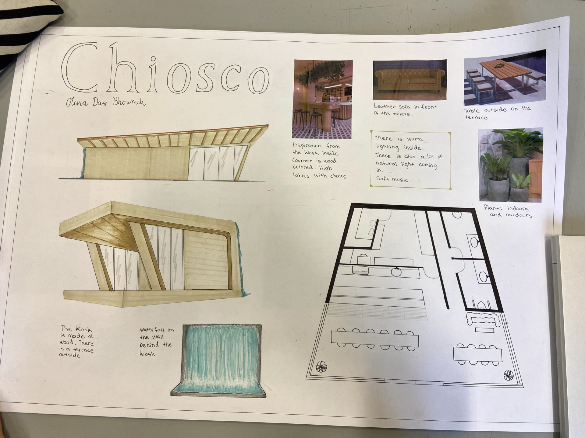 Teimme arkkitehtuurin tunneilla teimme erilaisia projekteja. Yhdessä tehtävässä piti suunnitella puisto, josta tehtiin ns. konseptikuva, isolle paperille koottiin kuvia ja tekstiä. Sen jälkeen suunniteltiin puistoon kioski, josta tehtiin toinen työ. Viimeisessä projektissa, jonka ehdin tehdä, suunnittelimme portaat. Mallinsimme ne ensin 3D:nä SketchUpissa, sen jälkeen tehtiin 2D-viivapiirros AutoCADilla ja lopuksi rakensimme pienoismallit. Alempana on kuvia töistäni. Aloittelija minä olin, mutta tekeminen oli todella hauskaa ja mielenkiintoista.