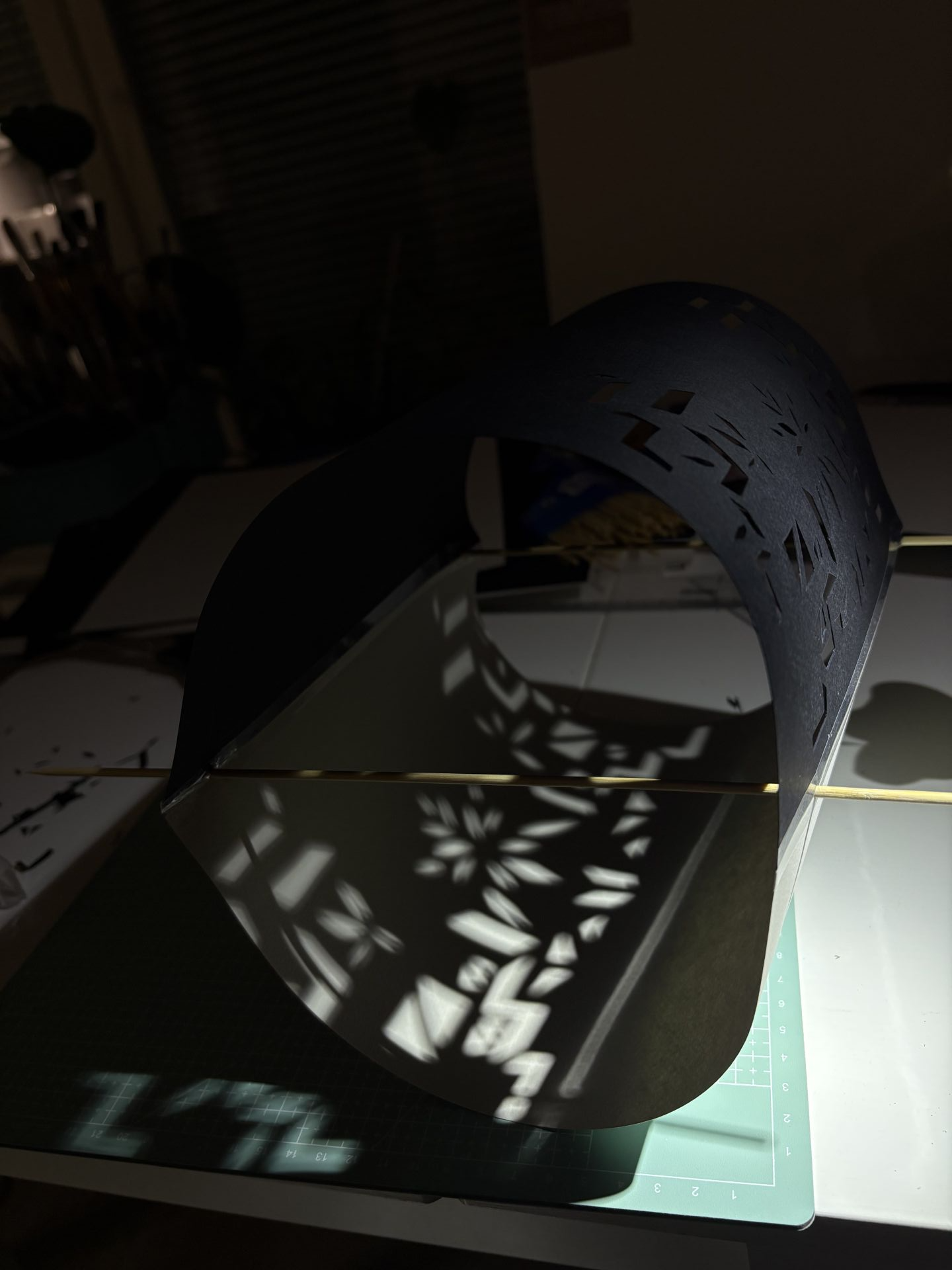 Ensimmäinen tehtävä oli tekninen ja vaati sorminäppäryyttä. Mustan ja harmaan kartongin jännittäminen puutikkujen varaan tuntui aluksi mahdottomalta – kartonki tuntui elävän omaa elämäänsä.
