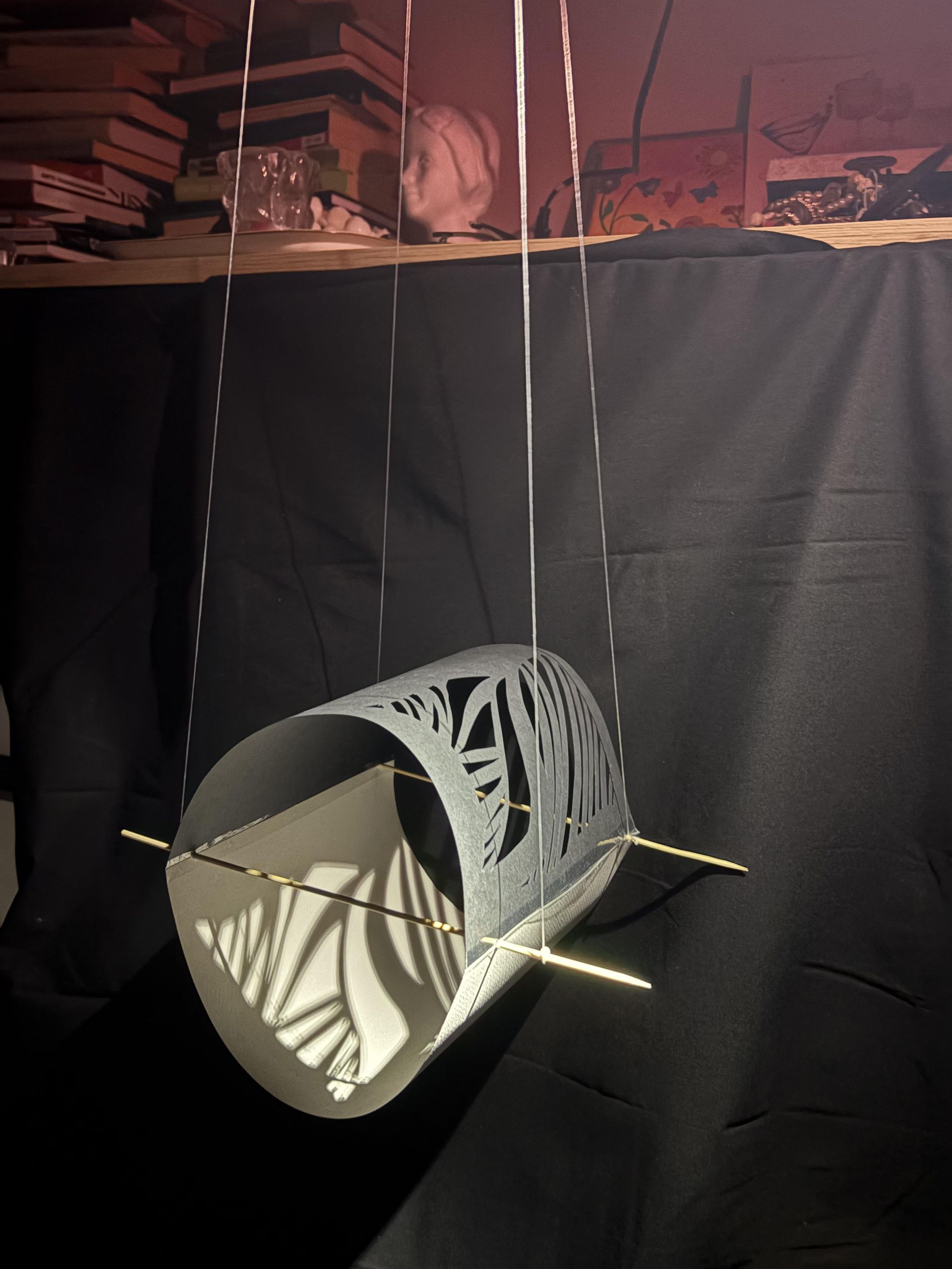 "Hämärä tila" piti saada roikkumaan ohjeiden mukaisesti, joten virittelin rakennelman roikkumaan naruilla suoraan televisiosta. Seuraava haaste oli tausta: mikään seinä ei ollut tarpeeksi tasainen tai musta. Viime hetkellä, kun deadline jo hengitti niskaan, juoksin Prismaan ostamaan mustan lakanan. Kiinnitin lakanan lipastoon luodakseni mahdollisimman syvän ja häiriöttömän taustan.