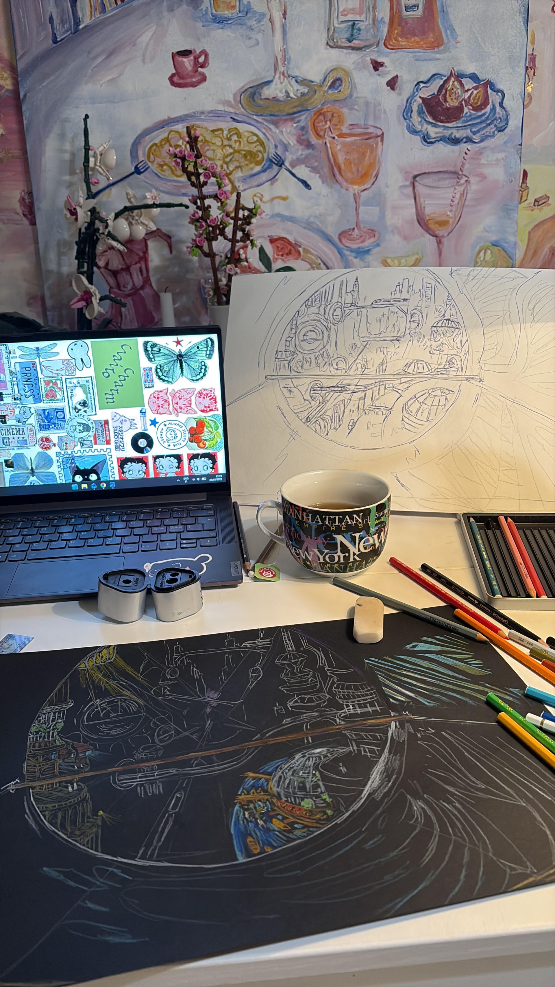 Jos kaipaat visuaalista inspiraatiota tai haluat nähdä, mihin suuntaan tyylini kehittyy ennakkotehtävien ulkopuolella, suuntaa Iso Roobertinkadulle! HI-HAT Art Barissa aukeaa 30.4. näyttely, jossa on esillä kaksi teostani.