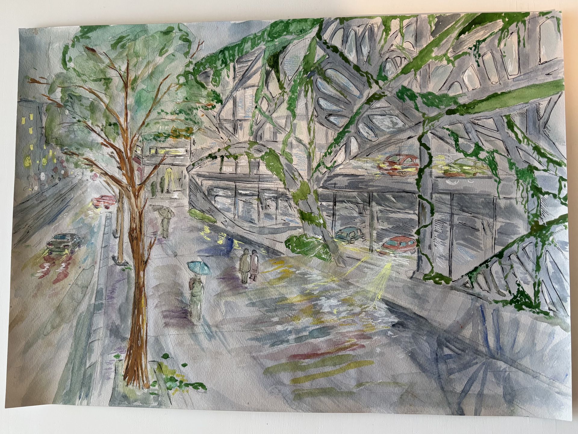 Tässä työssä painiskelin ”viherjulkisivun” ja ”sadepäivän” yhdistämisen kanssa. Miten sateen ja autojen valot heijastuvat lehdistä? Vaikka vesivärit ja kynäjälki tuntuivat välillä lipsuvan, huomasin, että sateen luoma epätarkkuus vain tuki hämärän tunnelmaa. Se opetti, että arkkitehtuurissa ympäristö ja sää ovat yhtä tärkeitä kuin itse rakennus.