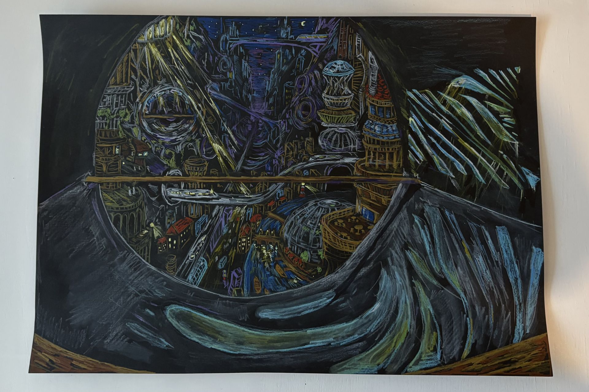 B-tehtävässä piti hypätä rakennelman sisään pienen hahmon silmin. Tämä oli henkisesti tehtävistä haastavin: miten yhdistää konkreettinen A-tehtävän muoto scifi-henkiseen kaupunkikuvaan? Piirtäessäni mustalle paperille pelkäsin jatkuvasti, että hukutan hienot valokuviot liian tiheään kaupunkiin.